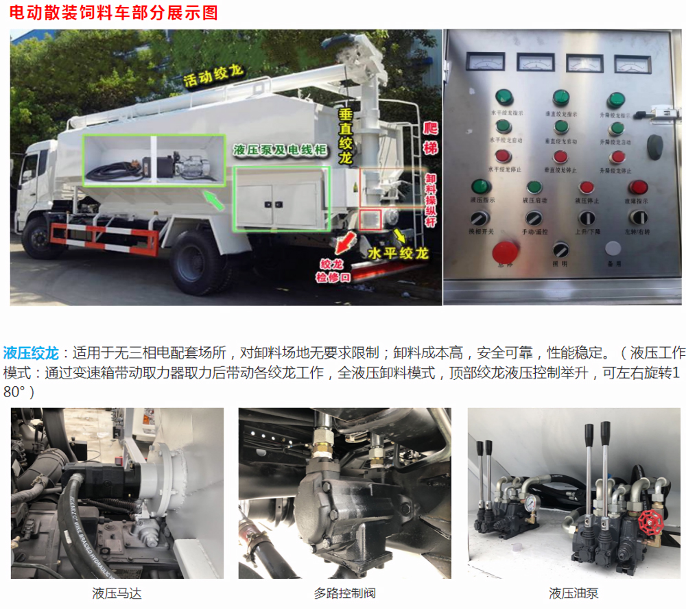 轉(zhuǎn),聯(lián)鎖保護(hù)等功能。無(wú)三相電場(chǎng)所可加裝車載發(fā)電機(jī)供電。卸料可選裝無(wú)線遙控操作。】第二種:液壓馬達(dá)卸