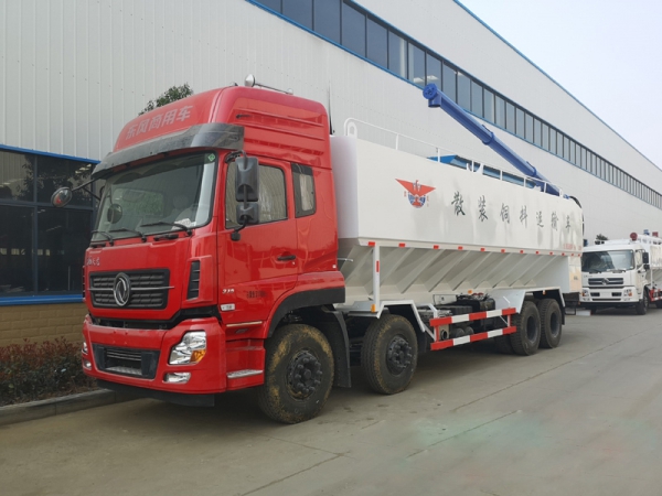 散裝飼料運(yùn)輸車主要用于從飼料廠向畜牧場(chǎng)養(yǎng)禽場(chǎng)及飼料加工用戶運(yùn)輸散裝飼料成品或飼料生產(chǎn)原糧,同時(shí)它也可用來(lái)運(yùn)輸某些無(wú)腐蝕性粉粒狀原料,如制藥廠粉料和糧庫(kù)周轉(zhuǎn)。散裝飼料車的飼料罐架設(shè)在卡車的底盤上,罐頂開有進(jìn)料口.頂部的一根螺旋輸送卸料管(俗稱卸料絞龍)則可自由回轉(zhuǎn)和抬升,抬升的仰角可達(dá)60度。運(yùn)輸時(shí),頂部的螺旋管平臥在罐頂;卸料時(shí)則抬起,使管端的出料口與畜禽飼養(yǎng)場(chǎng)貯料罐頂部的進(jìn)料門相接,駕駛室內(nèi)裝有操縱裝置(操縱裝置也可裝置在罐體尾部),卸料時(shí)通過(guò)車底的動(dòng)力輸出軸和減速器來(lái)驅(qū)動(dòng)螺旋,以完成卸料。目前國(guó)內(nèi)主要推出3T、5T、8T、11T、15T和22T等多個(gè)噸位車型。