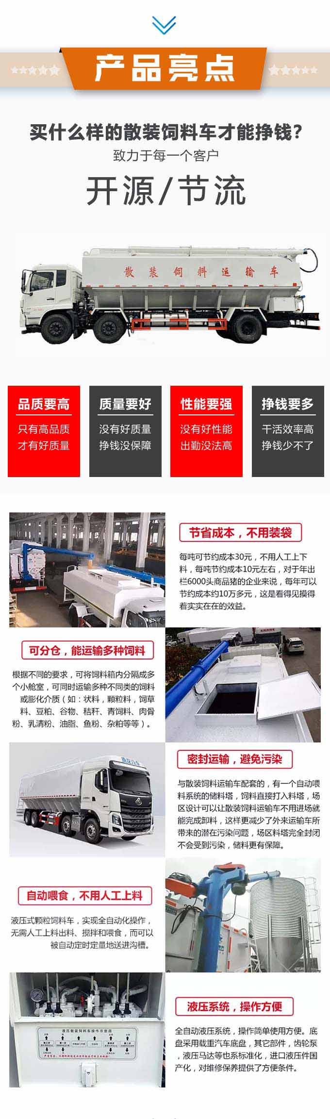 2、散裝飼料在罐體內(nèi)密封輸送,減少損失,保證質(zhì)量,避免污染。全自動(dòng)上料卸料,可連續(xù)作業(yè),大大提高生產(chǎn)效率。
