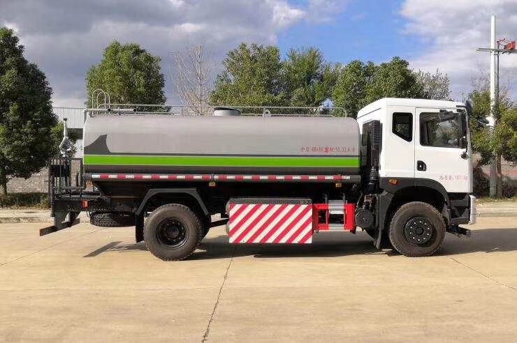 灑水車前裝有鴨形噴嘴或圓頭沖嘴,后面裝有圓柱開灑水噴嘴或蓮蓬頭噴嘴,后部有一工作平臺(tái),裝配有水炮。后部還可裝8個(gè)噴嘴(選裝)。