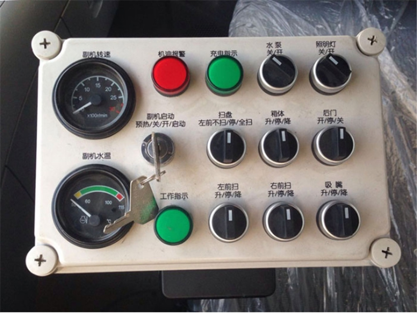9,一鍵PLC操作控制面板設(shè)計(jì),方便司機(jī)工作時(shí),在駕駛室內(nèi)就可以完成吸盤(pán)的收放,水路控制,垃圾傾倒和垃圾箱回位操作。