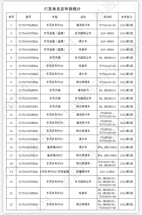 | 11 | CLT5185GPSDF6 | 東風天錦 | 綠化噴灑車 | B6.2NS6B210 | 2021第2批 |