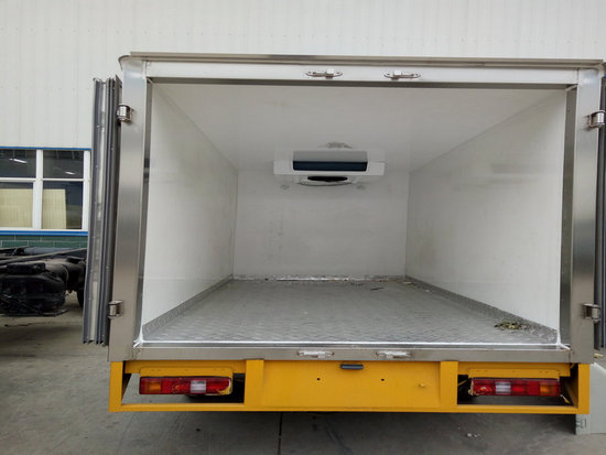 冷藏車廂體:采用國(guó)標(biāo)A級(jí)聚氨酯保溫材料,厚度為8厘米,廂體內(nèi)外采用玻璃鋼材質(zhì)全包裹。不銹鋼鎖件。包角、包邊鋁合金型材。底盤采用高強(qiáng)度花紋鋁板定制。可選裝肉鉤導(dǎo)軌,和底部通風(fēng)槽。廂體材質(zhì)為內(nèi)外玻璃鋼,中間夾層采用5個(gè)厚聚氨酯發(fā)泡隔熱材料,廂體一次成型,底板為花紋鋁板,門框邊飾全不銹鋼件,后門雙開。