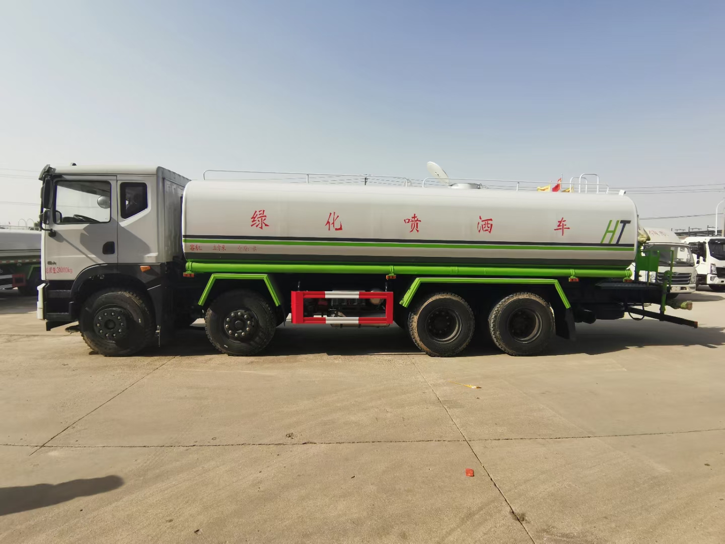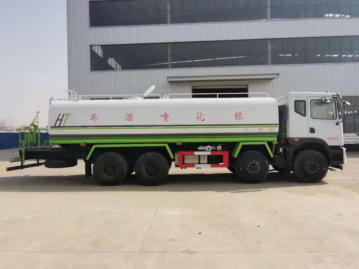 整車型號(hào):HTX5316GPSL6型綠化噴灑車,浩天星運(yùn)牌,底盤型號(hào)EQ1310GL6DJ ,發(fā)動(dòng)機(jī)為玉柴270馬力(YCS06270-60)國六排放標(biāo)準(zhǔn),軸距1850+3200+1350mm,華神T5駕駛室,陜齒大八檔變速箱(SC-8JS118TC-B)帶法蘭式取力器,5t雙前橋/10t后橋,11.00R20鋼絲胎,車架280mm,空調(diào),氣囊座椅,中控,多功能方向盤,行駛記錄儀。上裝:罐體采用標(biāo)準(zhǔn)Q235碳鋼制作,罐體自動(dòng)焊,裝水25噸,配大功率專用灑水車,可自吸自排,前沖后灑,側(cè)噴,高位花灑,主管道加粗,大通徑球閥,直通球閥式消防接口,帶后工作平臺(tái),沖孔平臺(tái),帶高炮。(可選裝大平臺(tái),可裝30米霧炮降塵)。