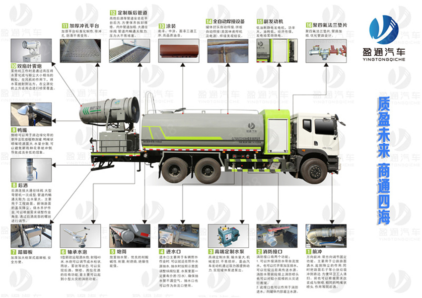 天錦22方灑水車(chē)_東風(fēng)天錦22方抑塵車(chē)_國(guó)六22方灑水車(chē)_湖北盈通專(zhuān)用汽車(chē)有限公司,車(chē)用途為抑塵降霾,主要裝置為罐體及噴霧裝置;隨底盤(pán)選裝駕駛室;罐體有效容積:20.2立方米,罐體外形尺寸(長(zhǎng)×長(zhǎng)軸×短軸)(mm):6700×2450×1580;側(cè)后防護(hù)情況:側(cè)、后防護(hù)材料均為:Q235碳鋼,連接方式均為:螺栓連接,后部防護(hù)截面尺寸(mm):120×50,后部防護(hù)離地高度(mm):480;ABS型號(hào)/生產(chǎn)廠家:3631010-C2000/東科克諾爾商用車(chē)制動(dòng)系統(tǒng)(十堰)有限公司,J ABS/焦作博瑞克控制技術(shù)有限公司.選裝噴霧裝置樣式。采用底盤(pán)4350+1350軸距(mm)。選裝擋泥板樣式。 |