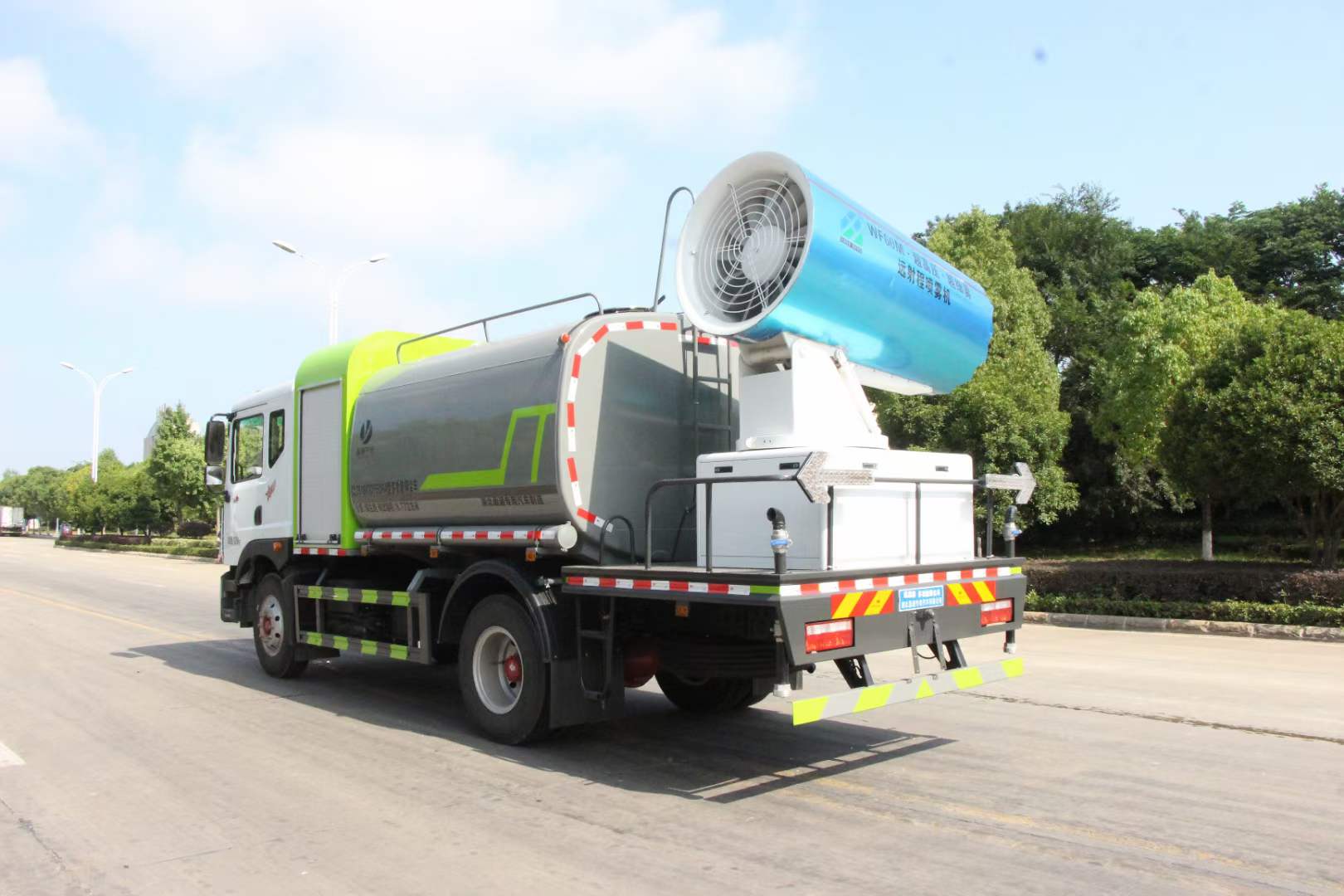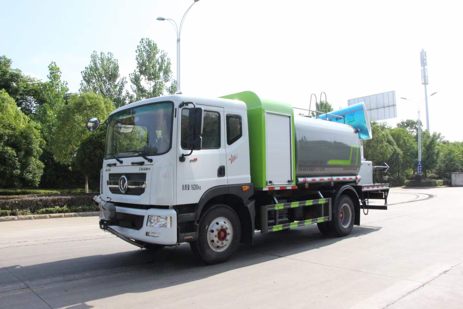 多利卡80米霧炮車_東風多利卡D9抑塵車_京牌12方抑塵車_湖北盈通專用汽車有限公司,該車用途為抑塵降霾.主要裝置為罐體及噴霧裝置.罐體總?cè)萘?/span>:9.2立方米,罐體有效容積:8.77立方米,罐體外形尺寸(長×長軸×短軸)(mm):2800×2450×1720.ABS系統(tǒng)生產(chǎn)廠家,型號 :焦作博瑞克控制技術(shù)有限公司,J ABS;襄陽東風隆誠機械有限責任公司,ABS/ASR-24V-4S/4M.隨底盤選裝限速裝置,限速裝置限速(km/h):89.側(cè)、后防護材料均為:Q235碳鋼,連接方式均為:螺栓連接,后部防護截面尺寸(mm):120×50,后部防護離地高度(mm):490.僅采用底盤3950mm軸距改裝.選裝燃油箱安裝位置.選裝噴霧裝置樣式,選前部電子炮樣式;選裝前部不帶電子霧炮.當前部選裝不帶電子霧炮時,車長7750mm,無前伸.當前部選裝帶電子霧炮時,車長8250mm,前伸為500mm. |