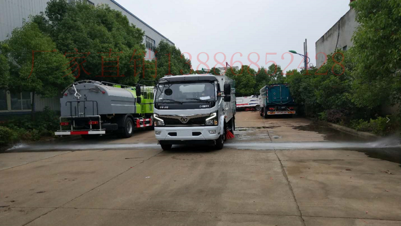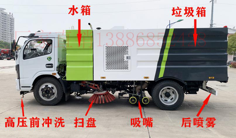 該洗掃車采用東風(fēng)多利卡國六二類底盤改裝,加裝副發(fā)動機(jī)、風(fēng)機(jī)、清水箱、垃圾箱、左右立掃、掃盤降塵系統(tǒng)、左右高壓側(cè)噴高、吸盤內(nèi)置高壓主噴桿、氣動系統(tǒng)、液壓系統(tǒng)、專用裝置電控系統(tǒng)和副車架等改裝而成。